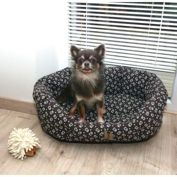 Pohodlný pelíšek pro psa s měkkým, ale pevným a odolným bavlněným potahem, který je vyplněný dutým vláknem. Oválný tvar s vnějšími rozměry 50x40 cm. Barva hnědá s bílými ornamenty.