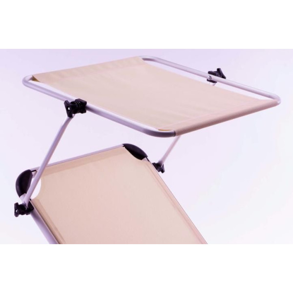 Relaxační lehátko se skládacím hliníkovým rámem s textilním výpletem béžové barvy, které je doplněno o nastavitelnou stříšku proti slunci.