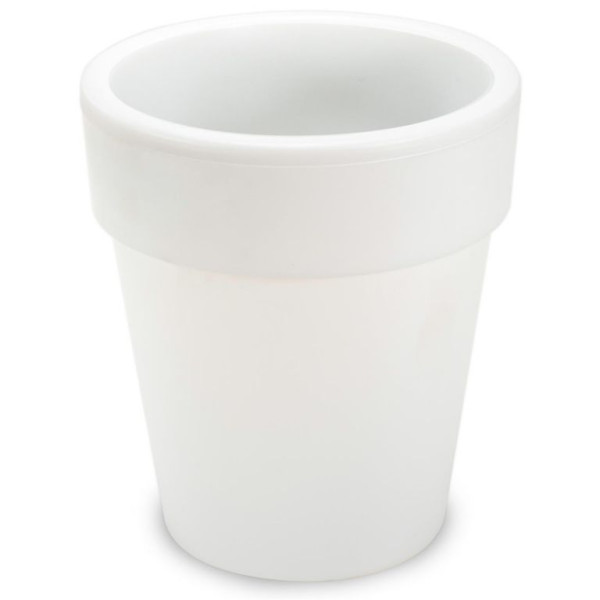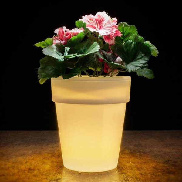 Dekorativní květináč se solárním osvětlením. Bílé provedení s teple žlutým světlem (podobné světlo, jako u klasické žárovky). Rozměry květináče jsou 19x17 cm.