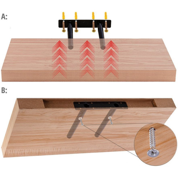 Sestává se z kovového držáku, který uchytíte na zeď a poličku na něj následně nasunete + zajistíte proti pohybu. Instalace je díky tomu velmi čistá- držák není vidět ze žádné strany.