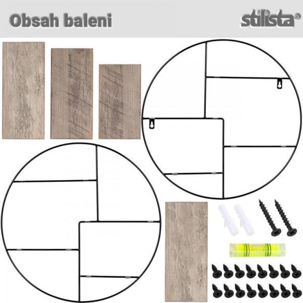 Dekorativní nástěnná polička kulatého tvaru, která se skládá z kovového rámu černé barvy a 4 poliček v dekoru tmavého dřeva. Celkové rozměry 48x48x12 cm.