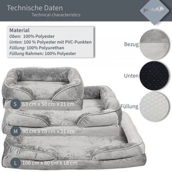 Kvalitní pelíšek pro psa s extra měkkým sametovým potahem, který je na zip- lze ho jednoduše sejmout a vyprat. Provedení se spodním polštářem a vyvýšenými okraji světle šedé barvy v rozměru 106x80x18 cm (délka x šířka x výška).