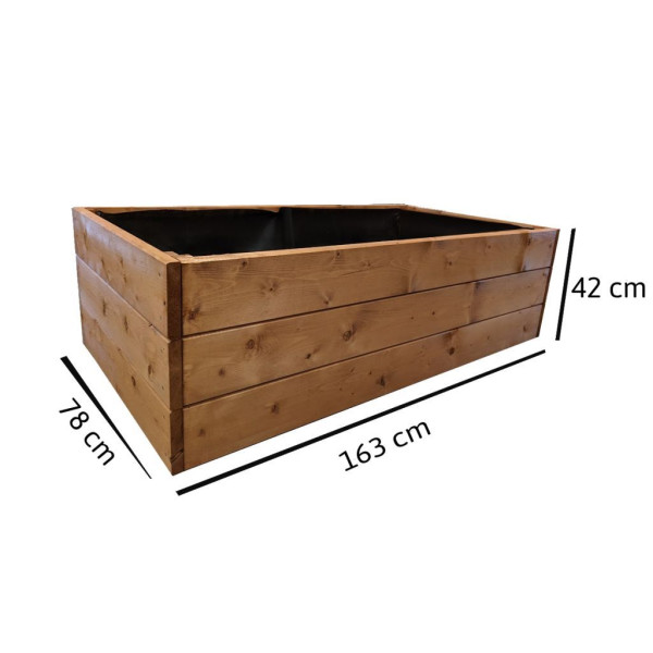 Vyvýšený záhon z masivních dřevěných desek, které jsou ošetřené lazurou proti vlhkosti a povětrnostním vlivům. Rozměry 163x78x42 cm. Tloušťka desek 2,8 cm.