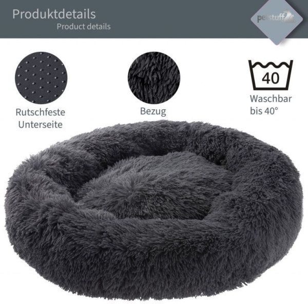 Měkký chlupatý plyšový pelech pro psa, kočku, nebo jiné domácí zvířátko v provedení o průměru 60 cm a výšce 20 cm tmavě šedé barvy.