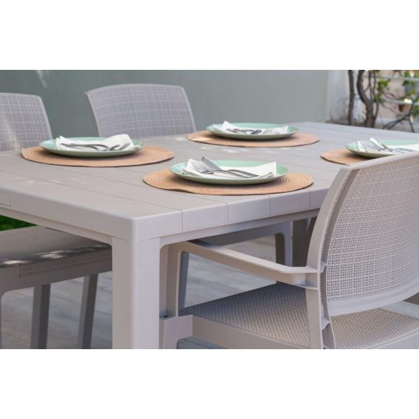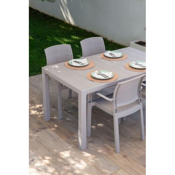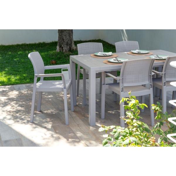 Moderní plastové zahradní křeslo s područkami ve světle šedé barvě. Zajímavě řešený sedák a opěrka, které jsou inspirované hrubou textilií – díky tomu je materiál křesla příjemně prodyšný a pohodlný i v horkých letních dnech. Navíc působí opravdu přitažlivě a elegantně.