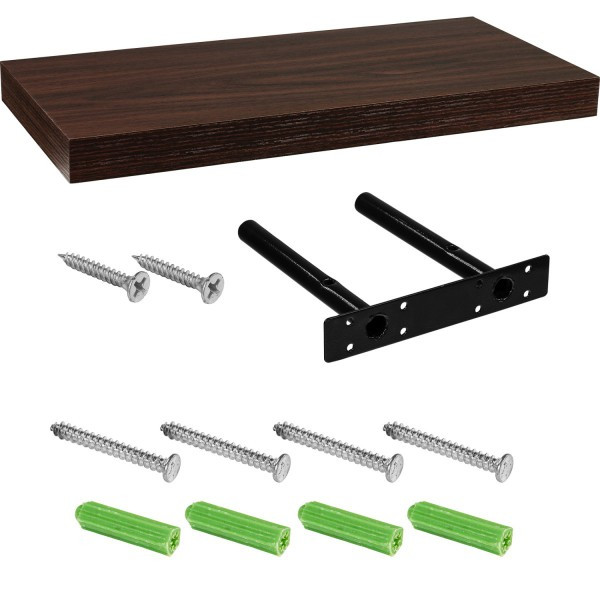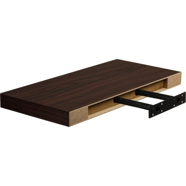 Moderní nástěnná polička v dekoru tmavého dřeva o délce 50 cm. Skryté uchycení, díky kterému tato polička působí, jako by se na stěně vznášela.