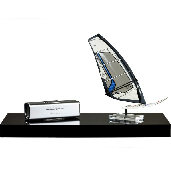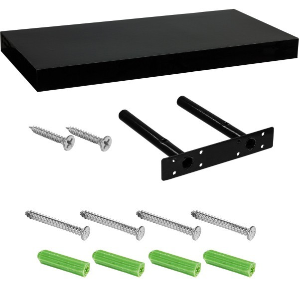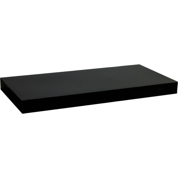 Moderní nástěnná polička černé lesklé barvy o délce 90 cm. Skryté uchycení, díky kterému tato polička působí, jako by se na stěně vznášela.