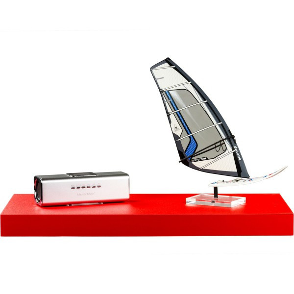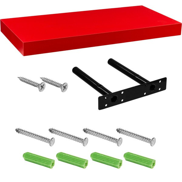 Moderní nástěnná polička červené barvy o délce 70 cm. Skryté uchycení, díky kterému tato polička působí, jako by se na stěně vznášela.